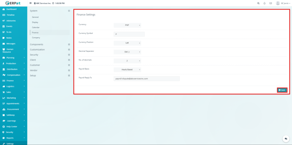 The Finance Tab is used to configure financial system settings including currency, formatting, and payroll preferences. These settings ensure consistency in financial records and reports.
