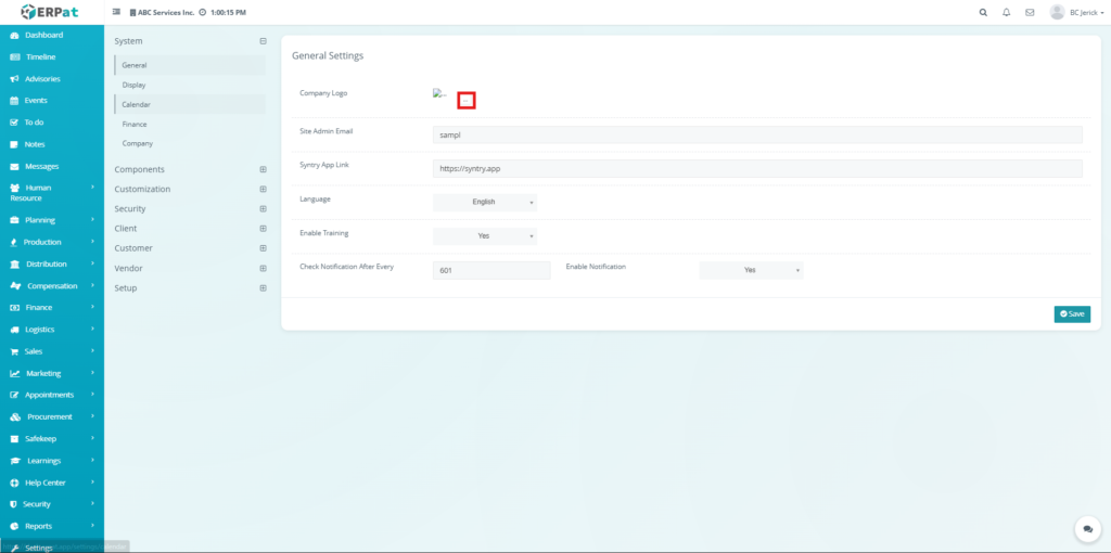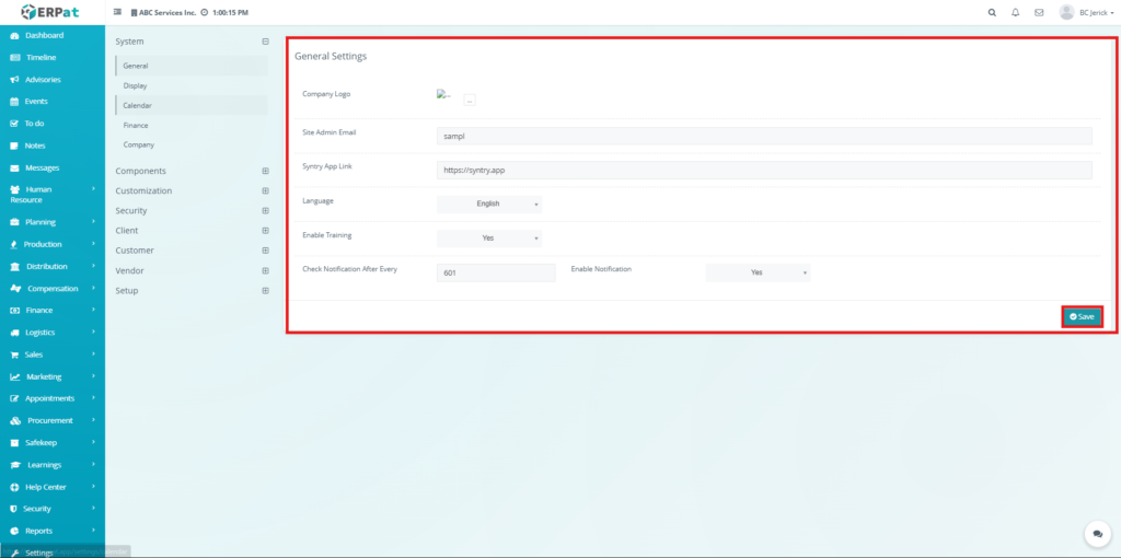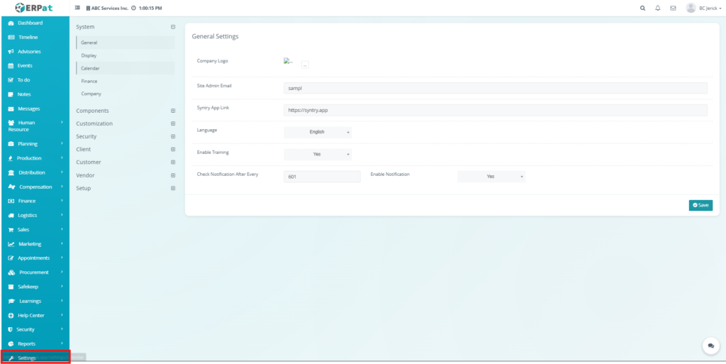 The System Module is used to configure core system-wide settings within the ERPat system. It allows administrators to manage general system behavior, display preferences, calendar configurations, financial settings, and company information.