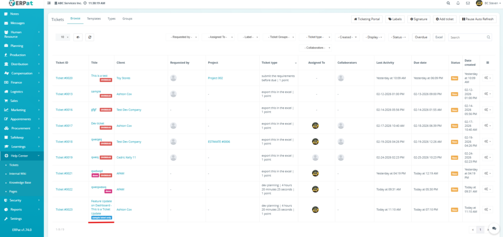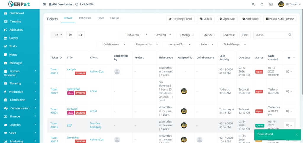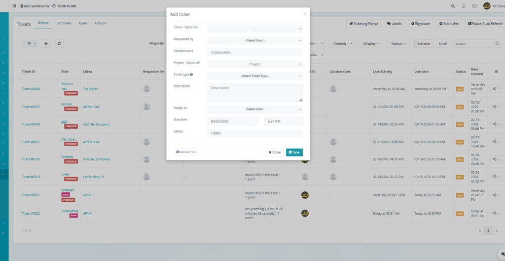 - Integrated Search and Filtering by client, project, ticket group, or creation date for efficient record retrieval.