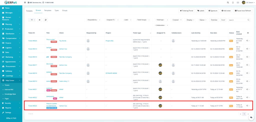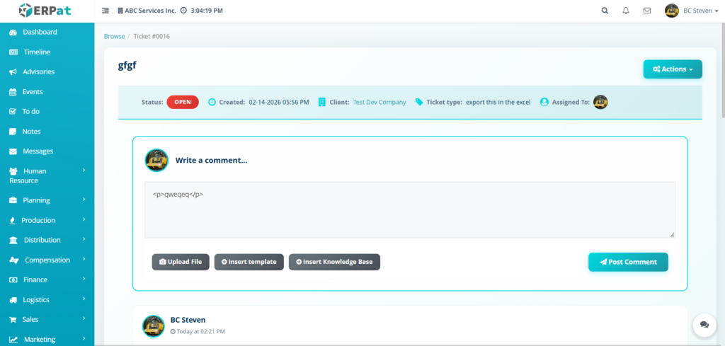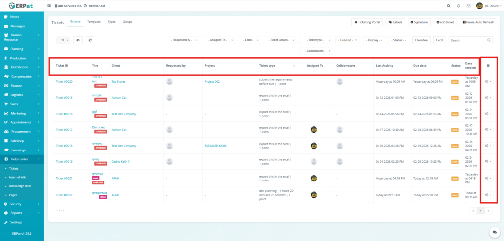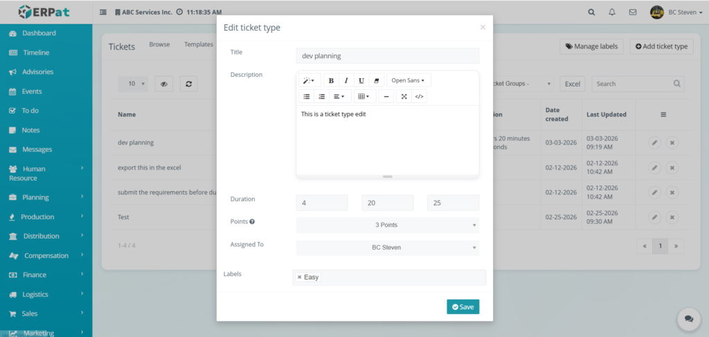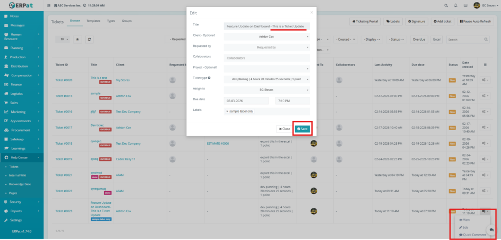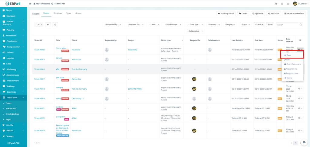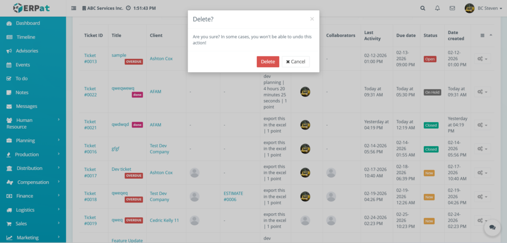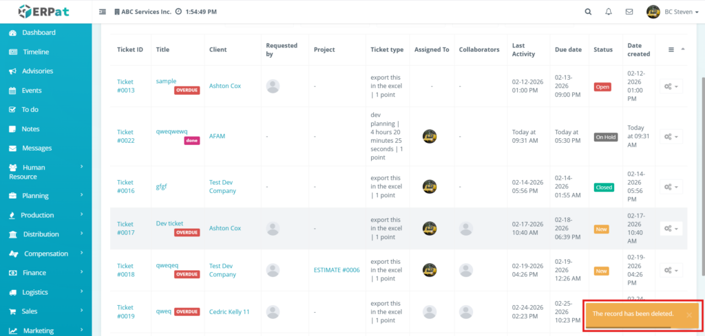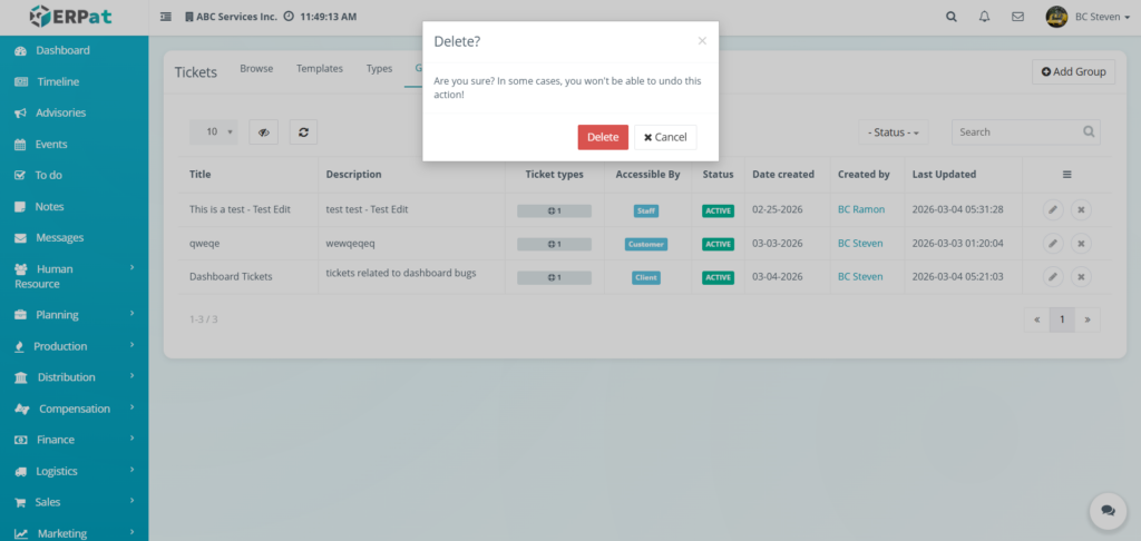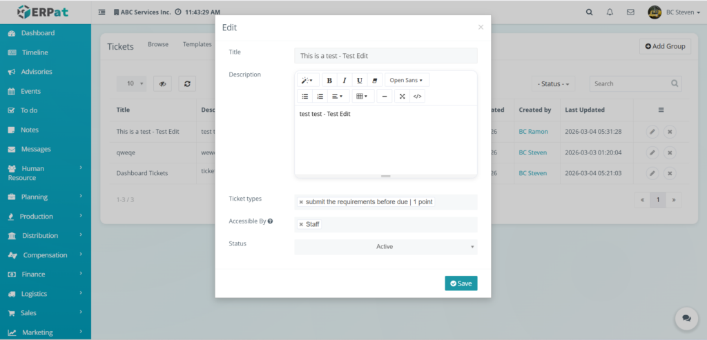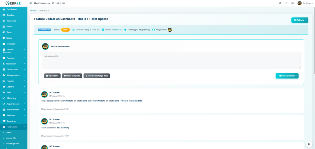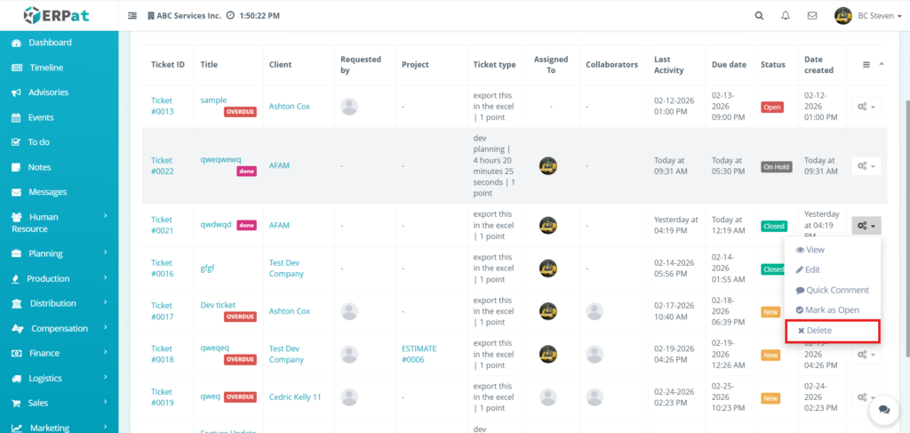 All create, update, and delete actions for tickets are logged for audit and compliance purposes within the ERPat System.