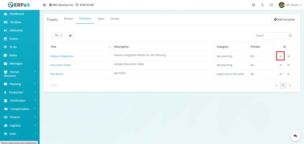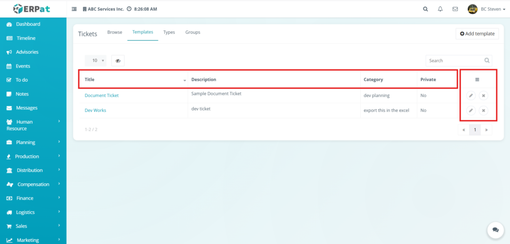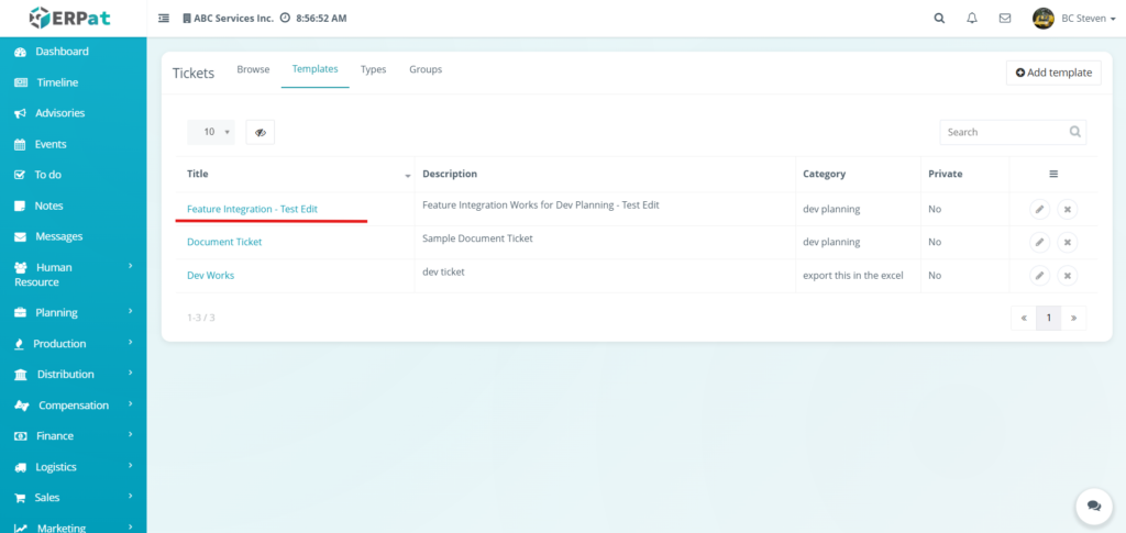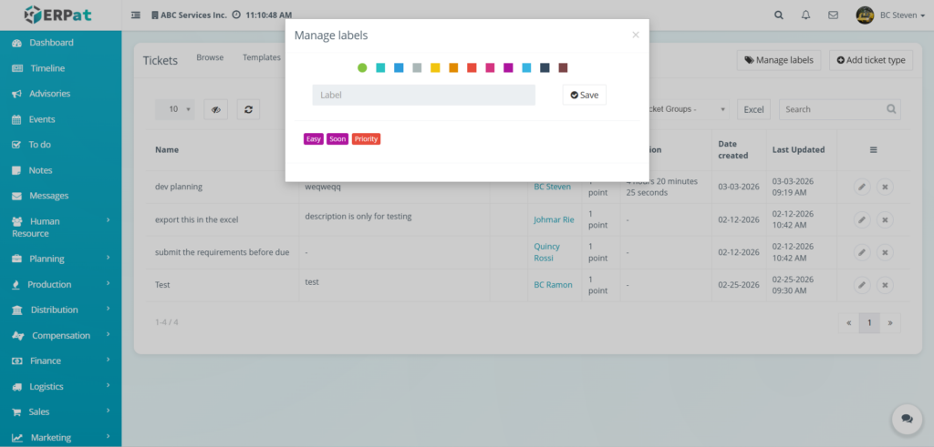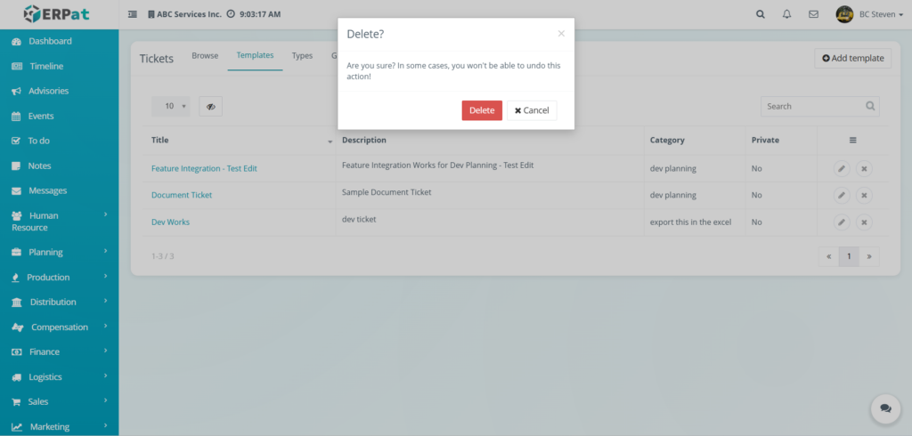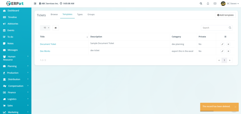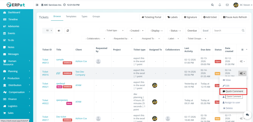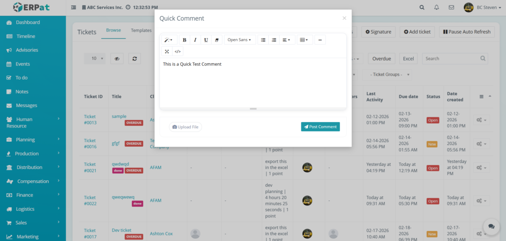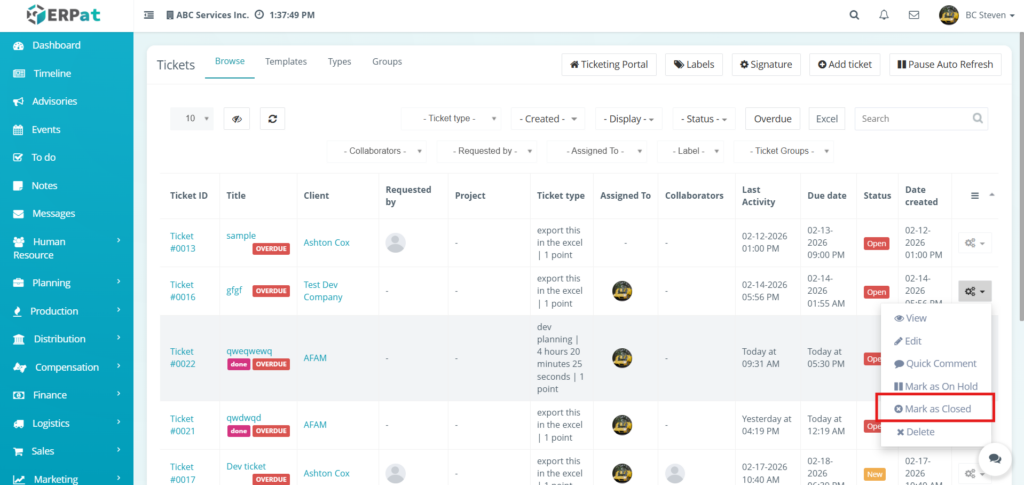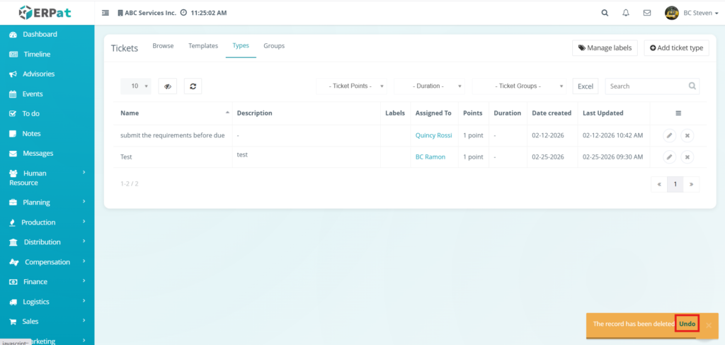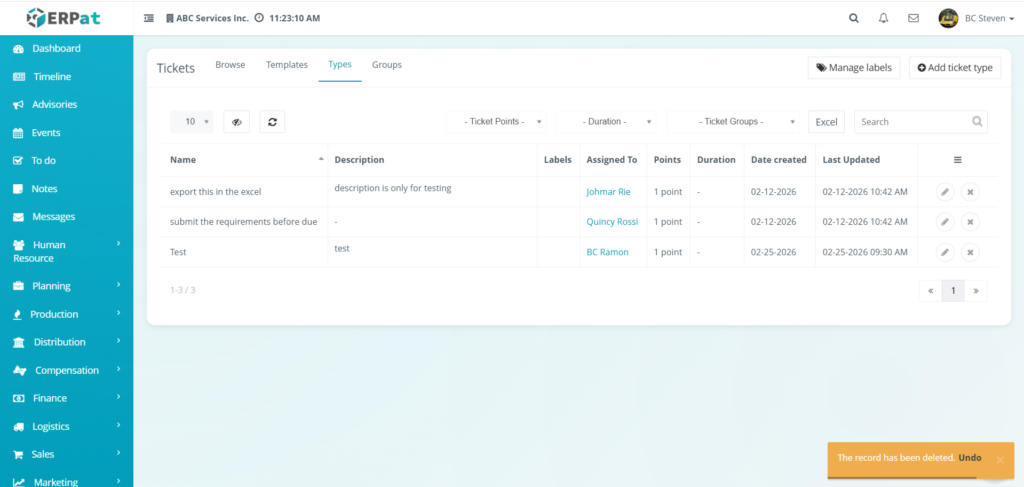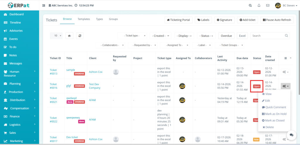 All create, update, and delete actions for tickets are logged for audit and compliance purposes within the ERPat System.