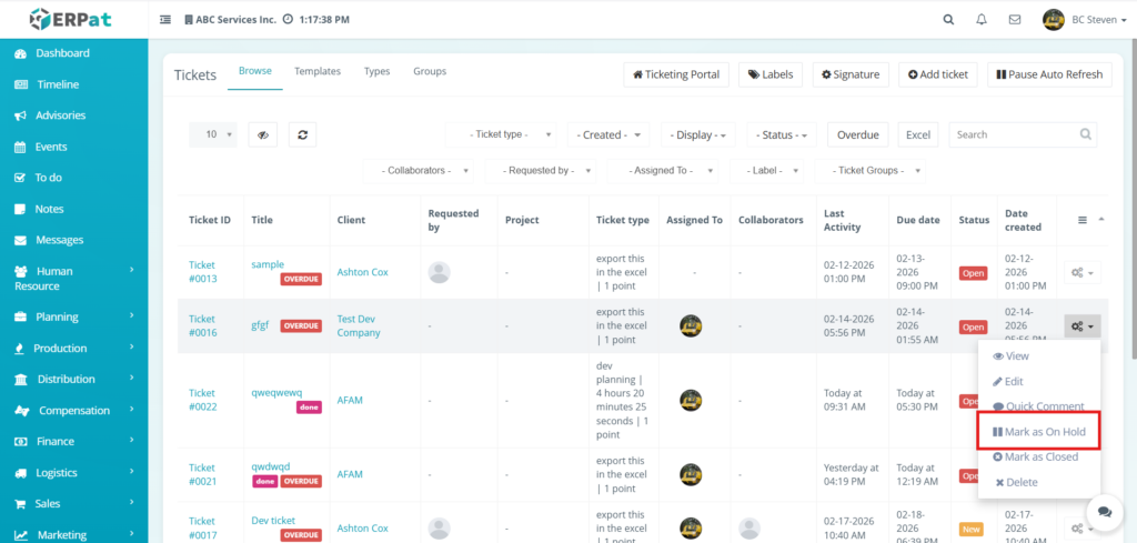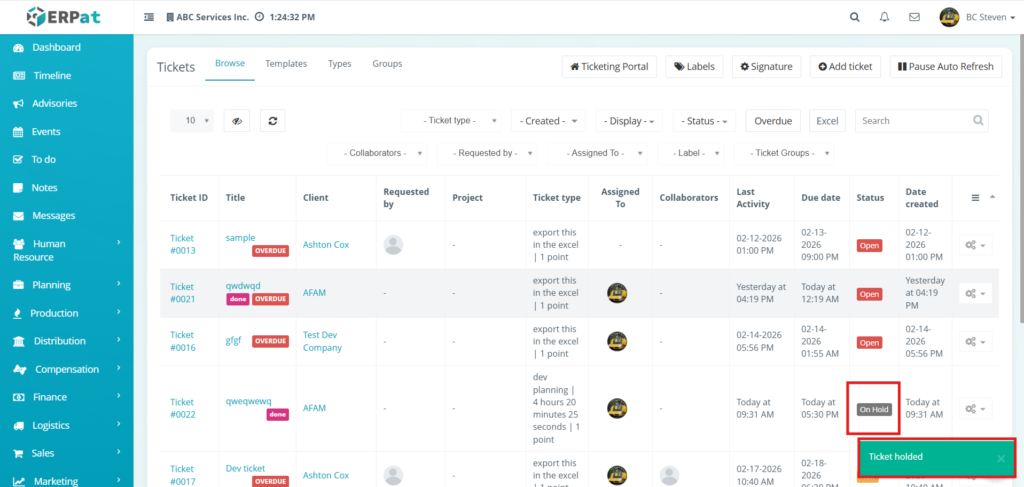 - Ticket whose status is “Open” are the only one that can be set to “On Hold”