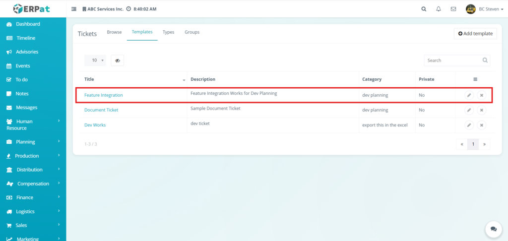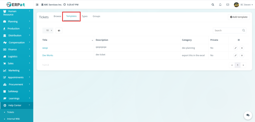 The Ticket Module is used to manage and track technical issues, service requests, and system inquiries through a centralized ticketing portal. It serves as a unified interface where users can browse existing tickets, utilize pre-defined templates, and categorize requests into specific types or groups for streamlined resolution.