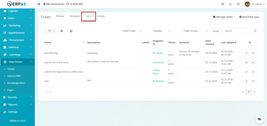 - Ticket types – Add or remove work classifications (e.g., submit the requirements before due | 1 point) linked to this group.