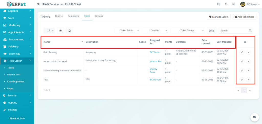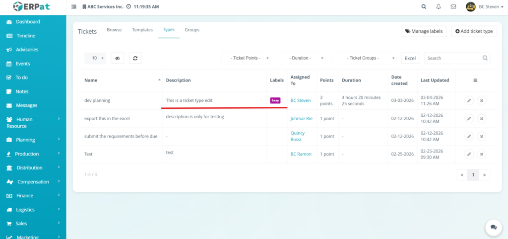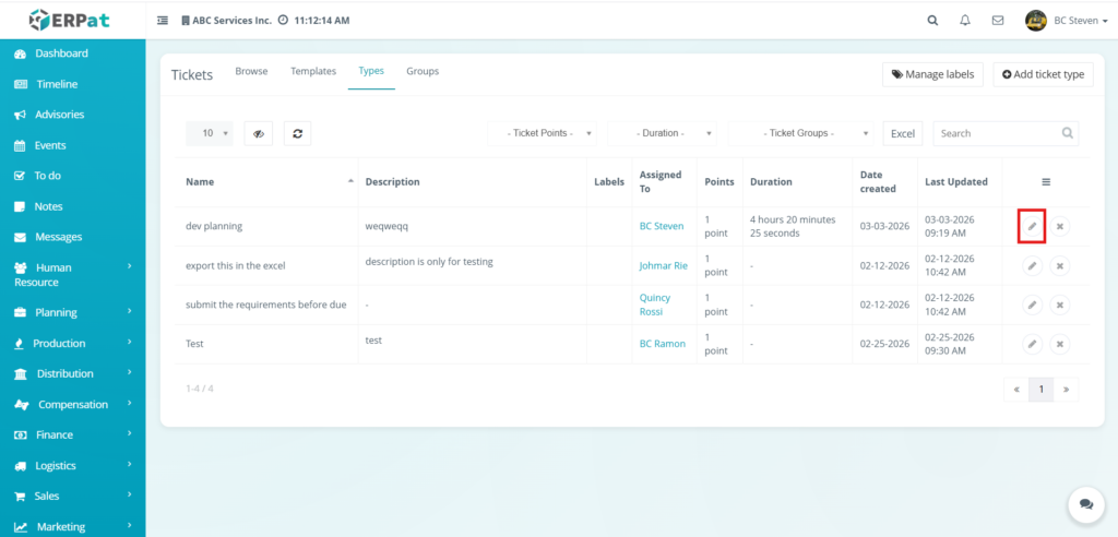 - Name – The unique label assigned to the ticket type (e.g., dev planning, Test).