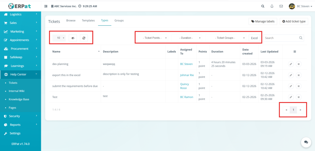 - Excel Button – A primary export tool used to download the current ticket type dataset into a spreadsheet format for external reporting or auditing.