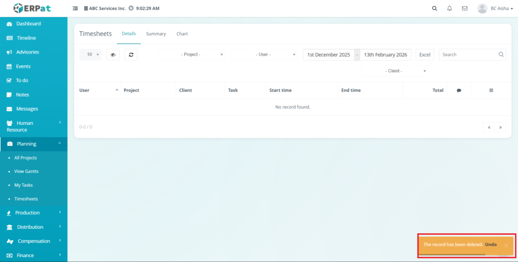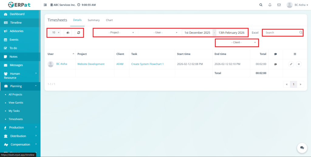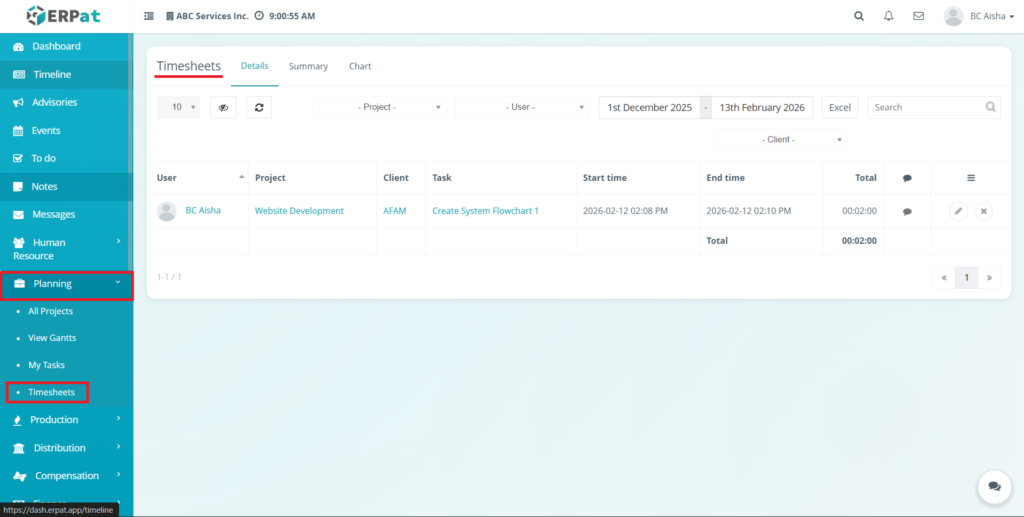 All timesheet actions—including modification, and deletion—are automatically recorded in the ERPat System Audit Logs to maintain transparency, compliance, and historical tracking of user work hours.